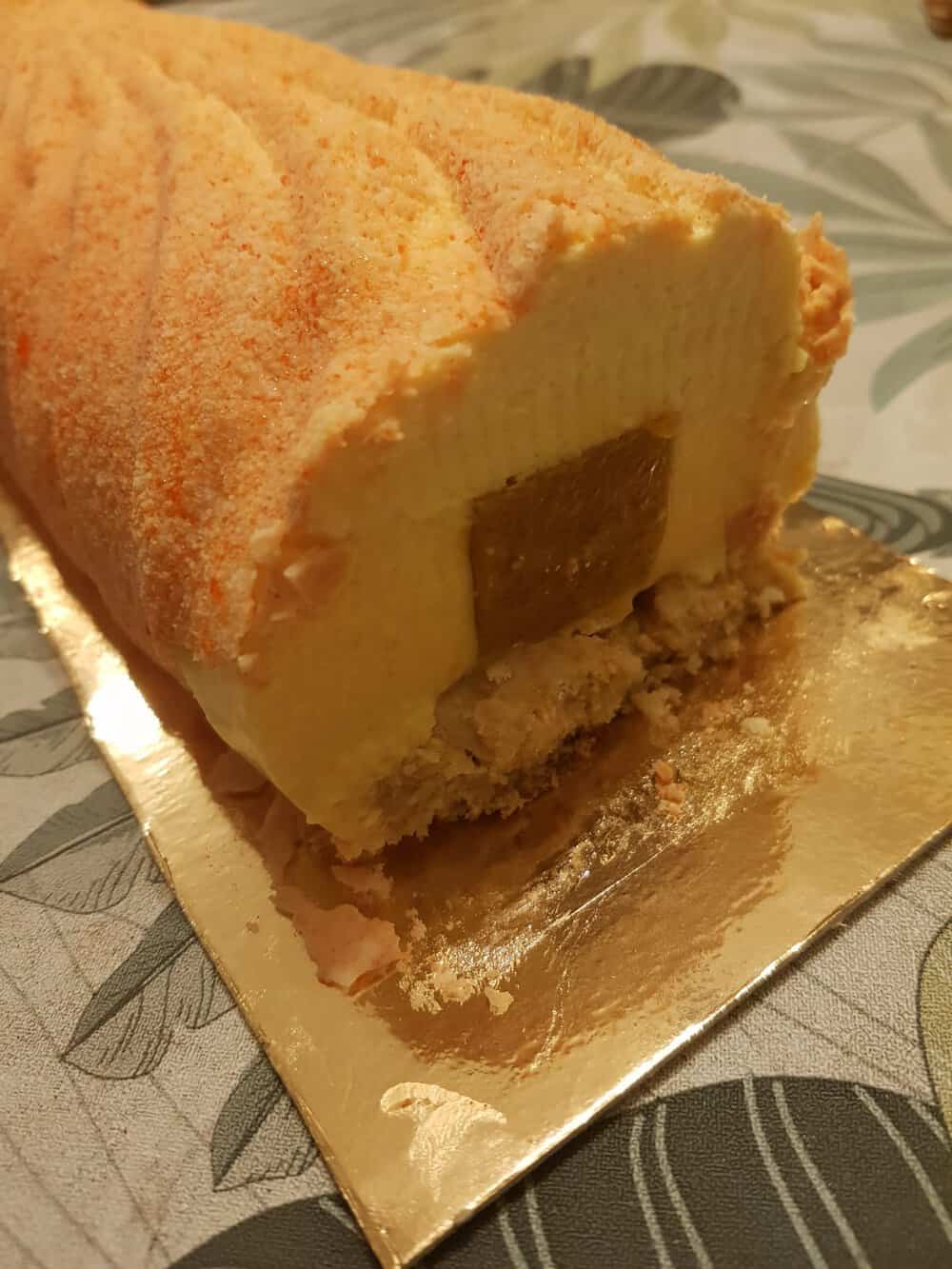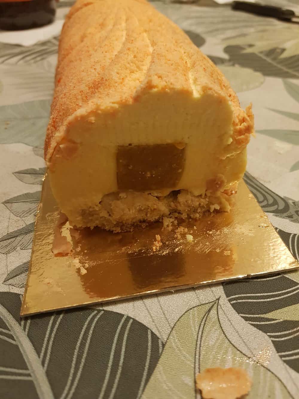 Une dacquoise coco et une mousse passion acidulée que vient contrebalancer la douceur d’un insert mangue.