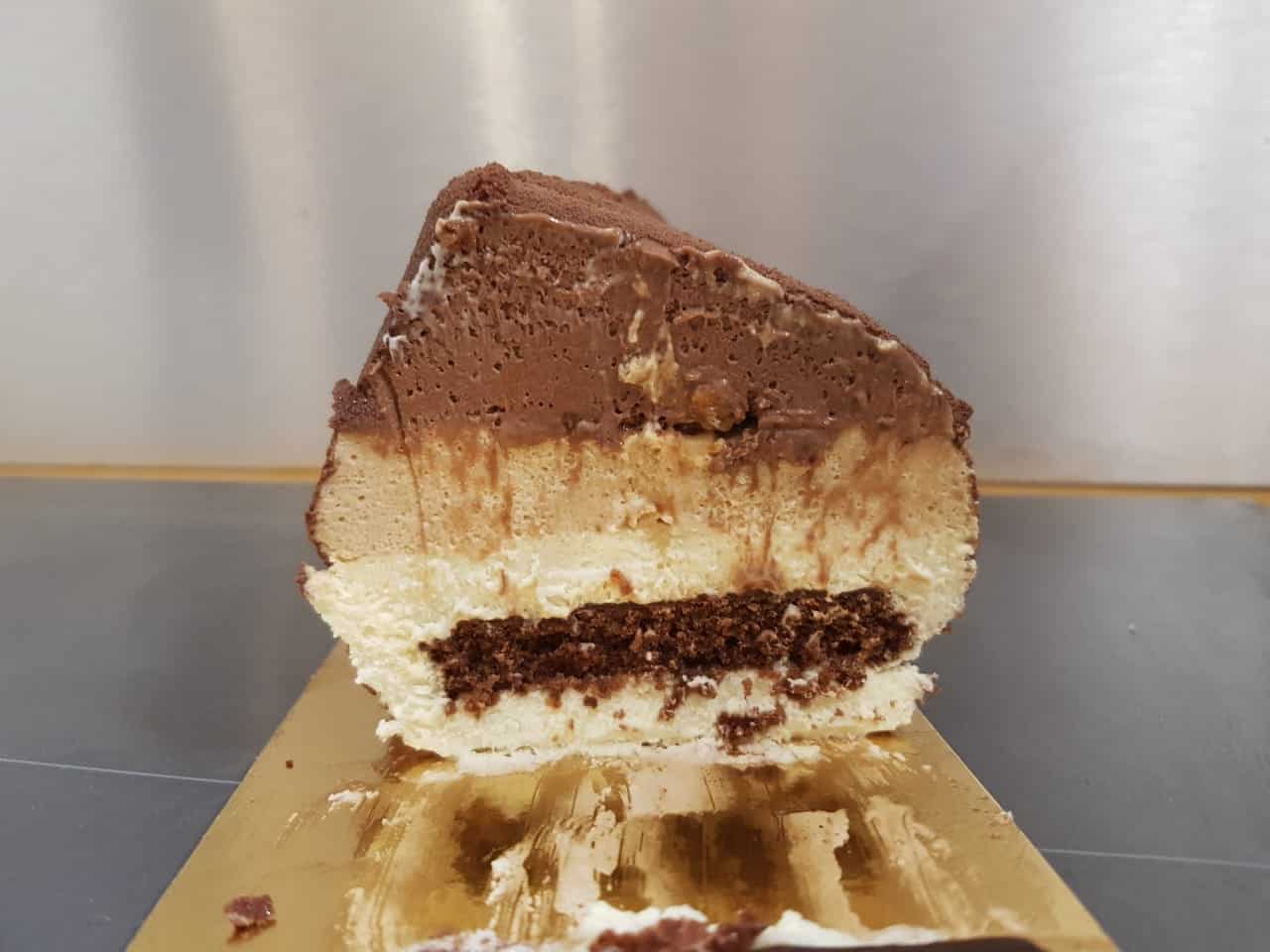 Une bûche composée d’un biscuit chocolat noisette surmonté d’un praliné feuilletine. Trois couches de mousse au chocolat ( chocolat noir chocolat dulcey et chocolat blanc) séparées par une fine couche de nougatine qui apporte du « gourmand croquant ».