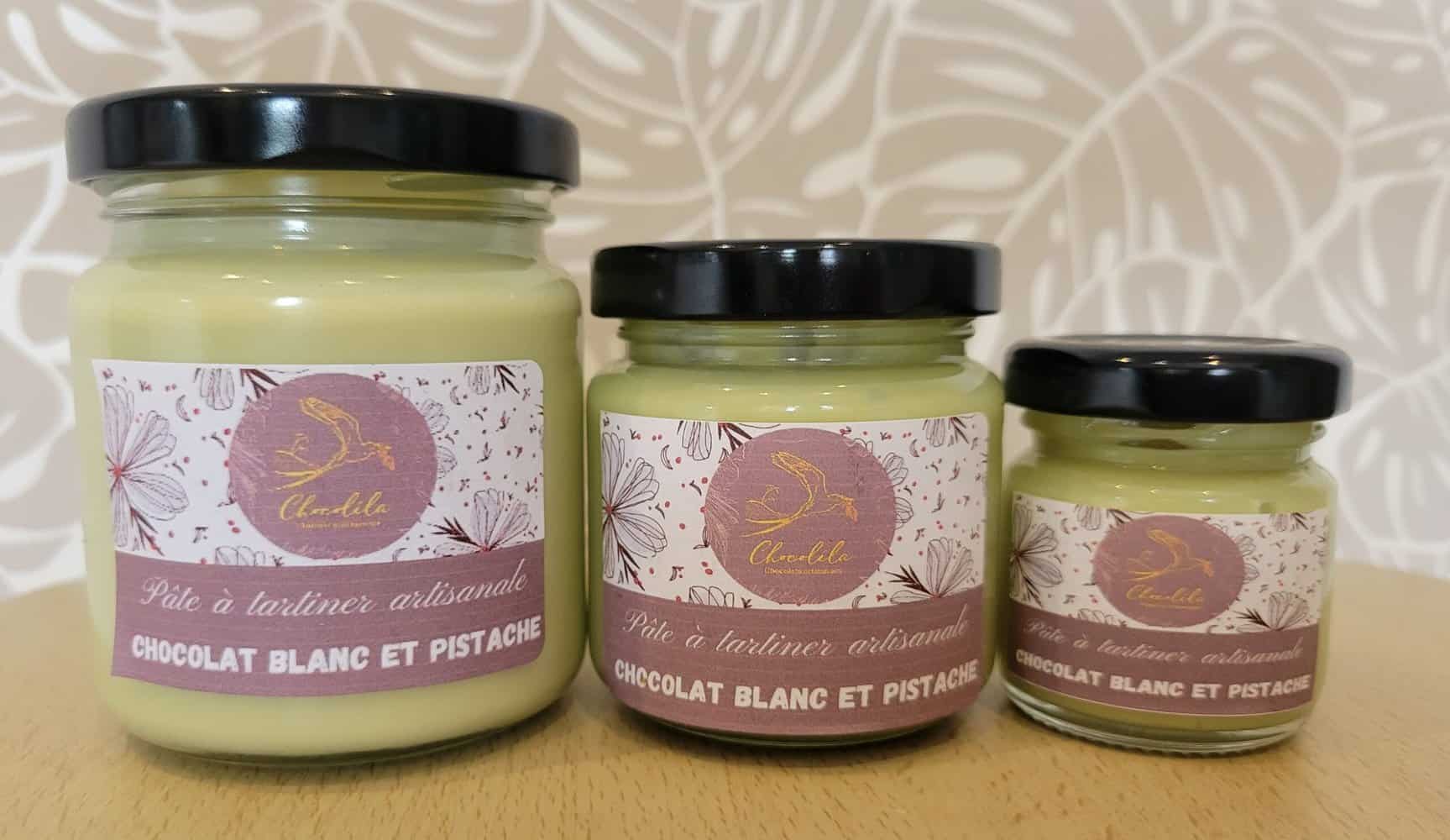 Sans additif ni conservateur, à base de chocolat blanc et de pâte de pistache.